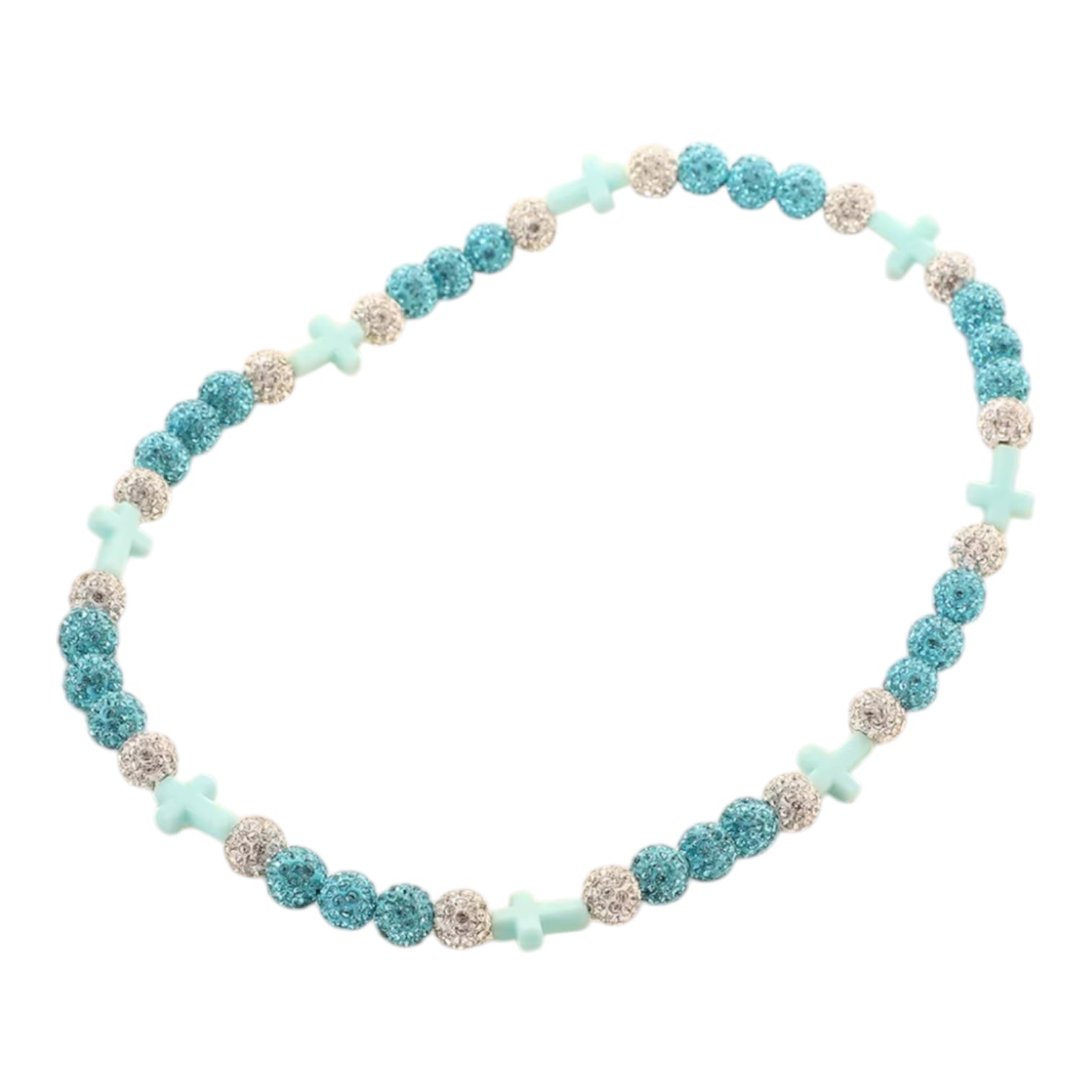 Beautiful clay cross bead necklace decorated with sparkling rhinestones. Designed especially for children, this necklace is lightweight, colourful, and comfortable to wear.